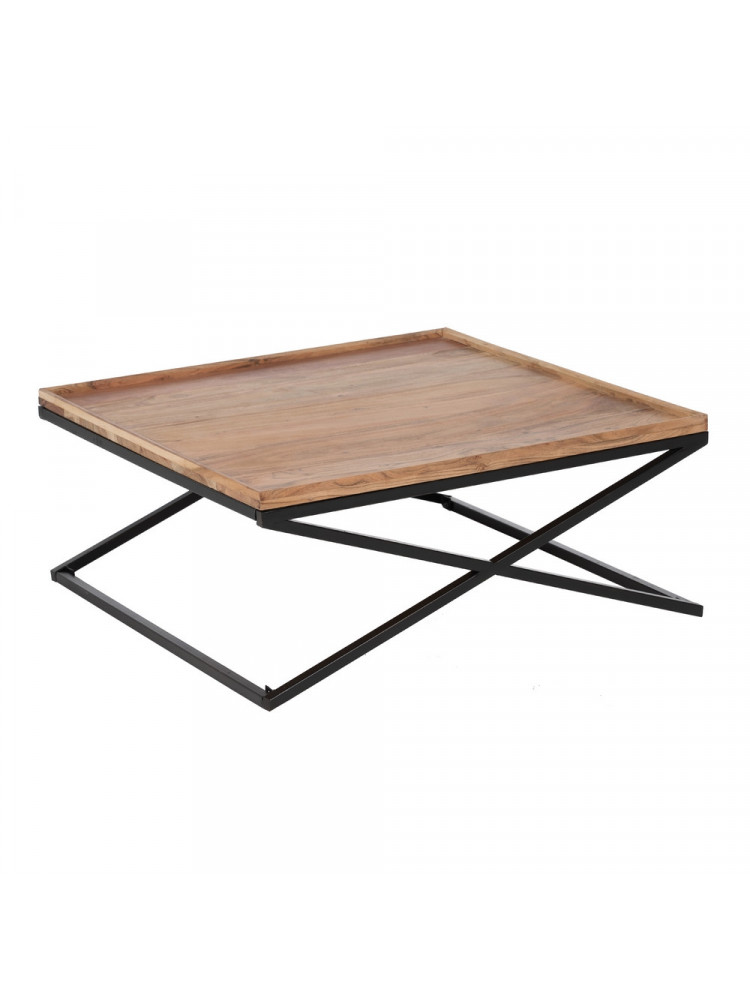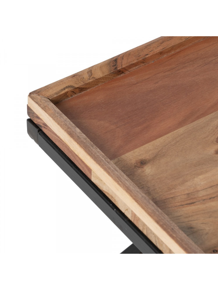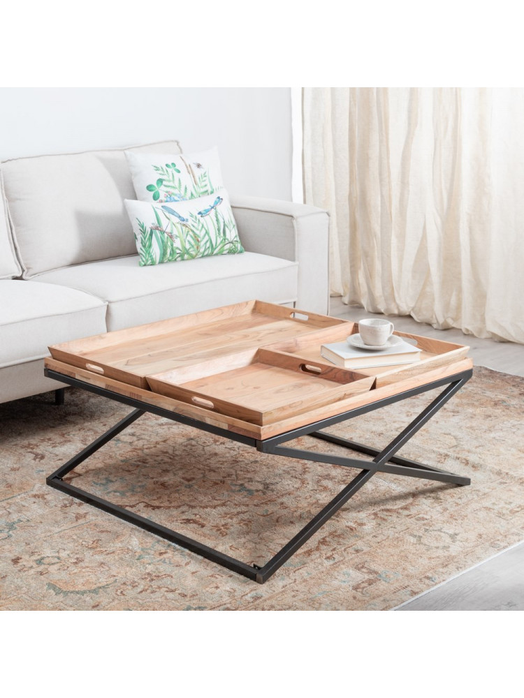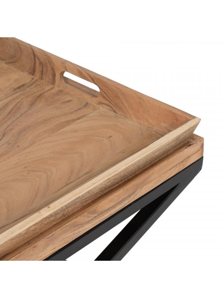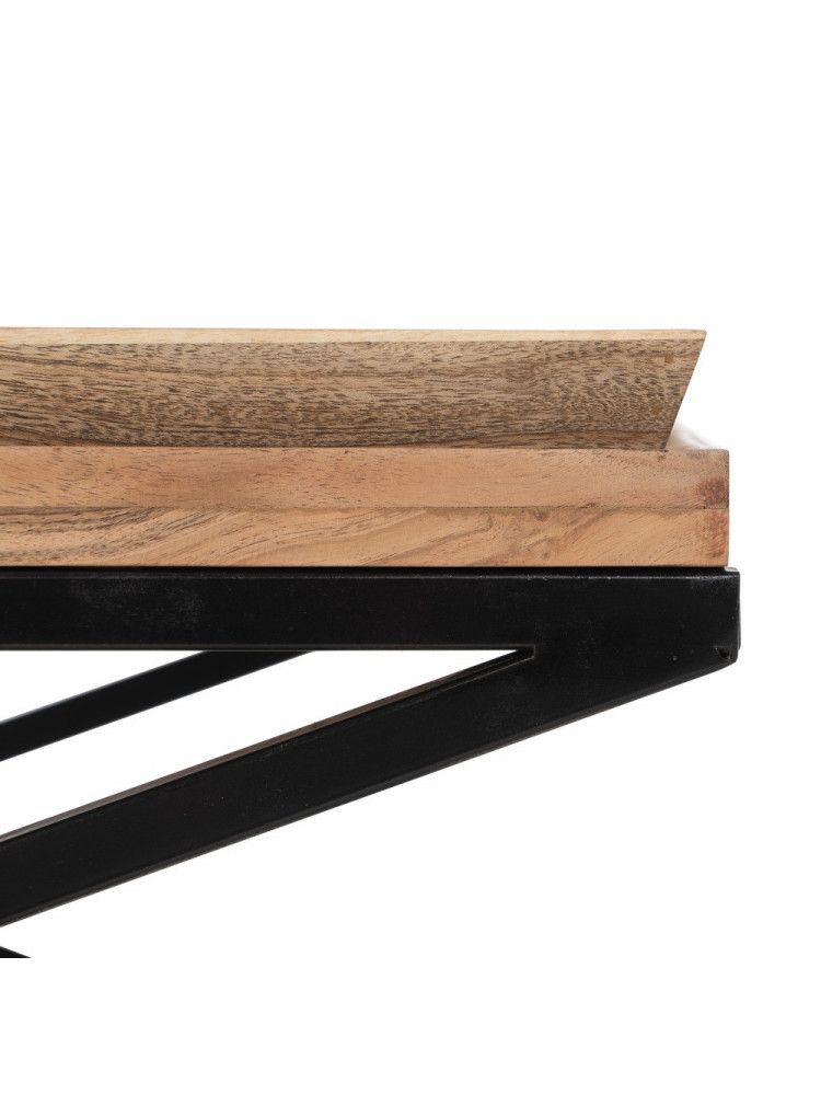 MESA CENTRO NATURAL MADERA DE MANGO 85 X 85 X 39 CM Material: Madera de mango y hierro. Altura patas: 33cm Bandeja grande: 84x42x5cm Bandeja pequeña: 42x42x5cm.